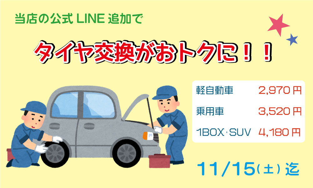 タイヤ交換 末広モータースのタイヤ交換は、車種によって3コースに料金が分かれています! 11/15(土)までに当店の公式LINEを追加して頂くと、それぞれが割引になります♪ LINE追加後、トーク画面をフロントに提示をお願いいたします! 今回だけではなく、お得なクーポンを定期的に配布しておりますので、この機会にぜひ追加してください☆ お友達登録はこちらから♪