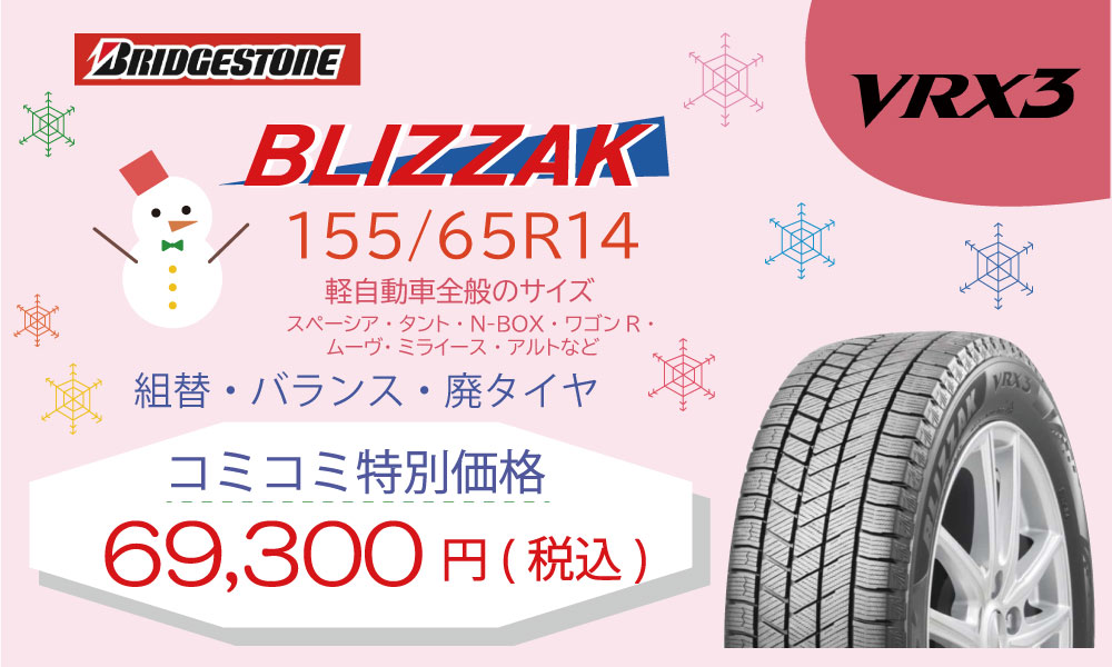 ホーム VRX3特価品 VRX3特価品 今年も残すところ30日を切りました! 夏に大人気で延長した企画・ブリヂストンの冬タイヤの特価品をバージョンアップして、BLIZZAK『VRX3』のタイヤを年末SALEとして企画致しました! さらに滑りにくく改良されたタイヤなので、冬道の悪路も安心できると思います! 数量限定品のため、購入をお考えのお客様は、事前にご連絡ください♪ 年末SALEをぜひお見逃しなく! 期間:12/9(火)~12/25(木)